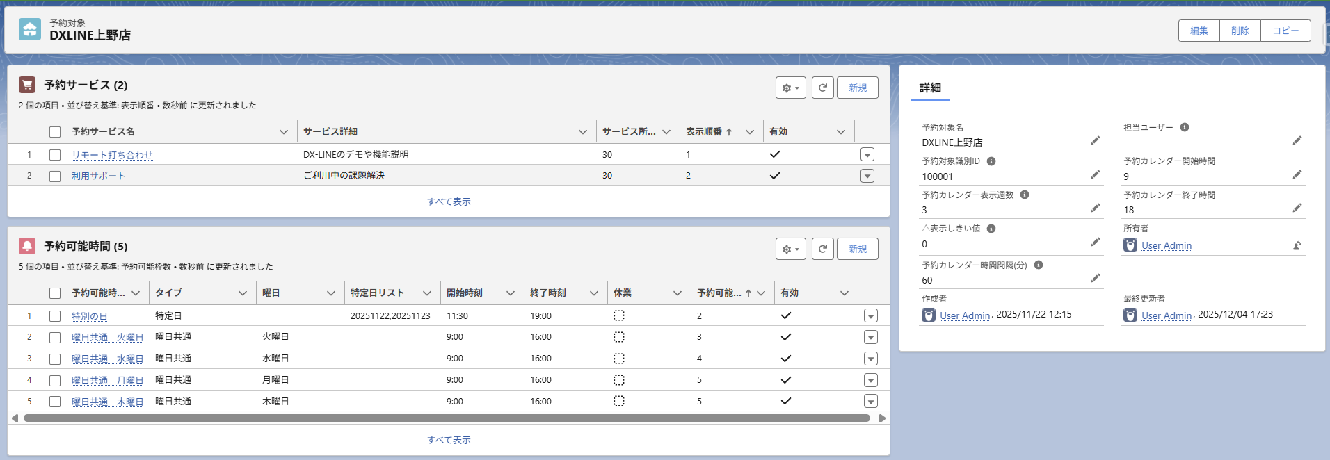 ・予約対象のコピーボタンは、関連する予約サービス、予約可能時間合わせてコピーできる。
