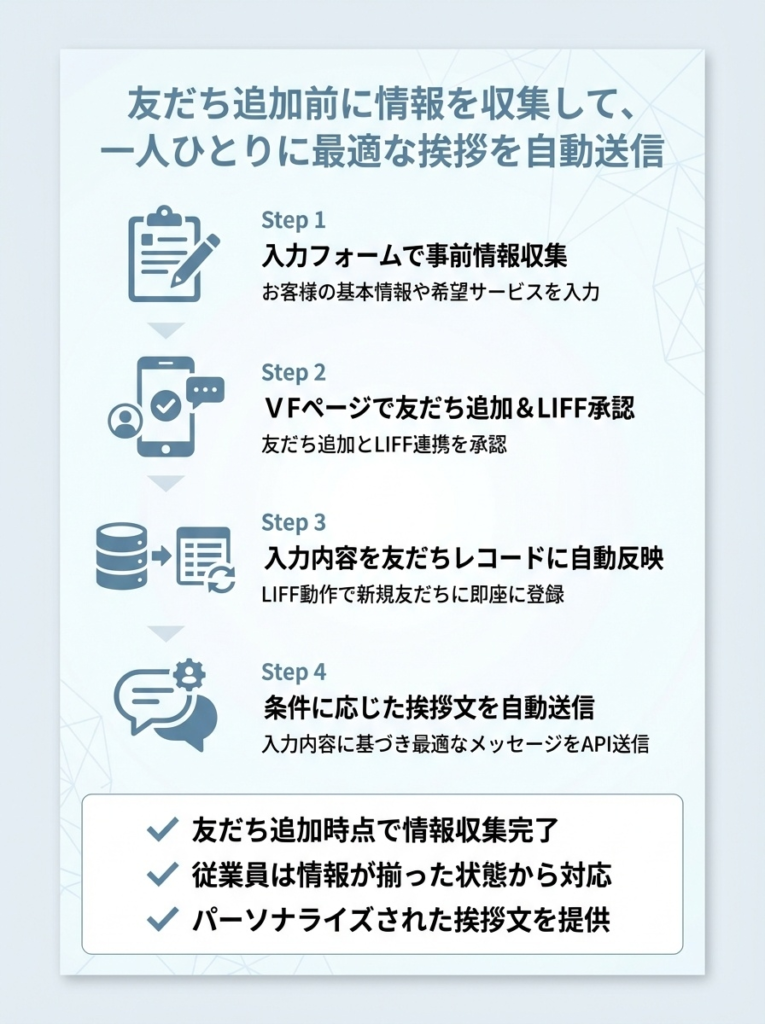 友だち追加前から顧客情報を取得し、最適な挨拶を自動送信する運用が可能になります。