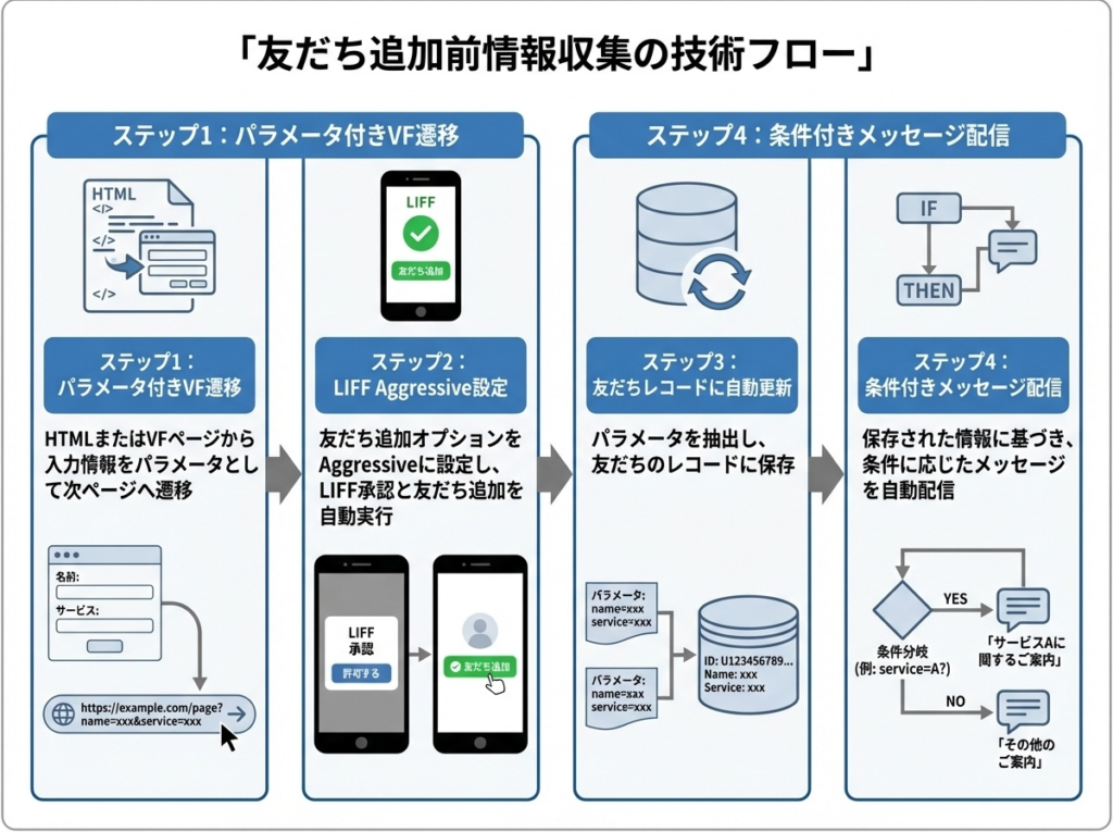 友だち追加前の情報収集とパーソナライズ配信を実現する具体的な技術フローを解説します。